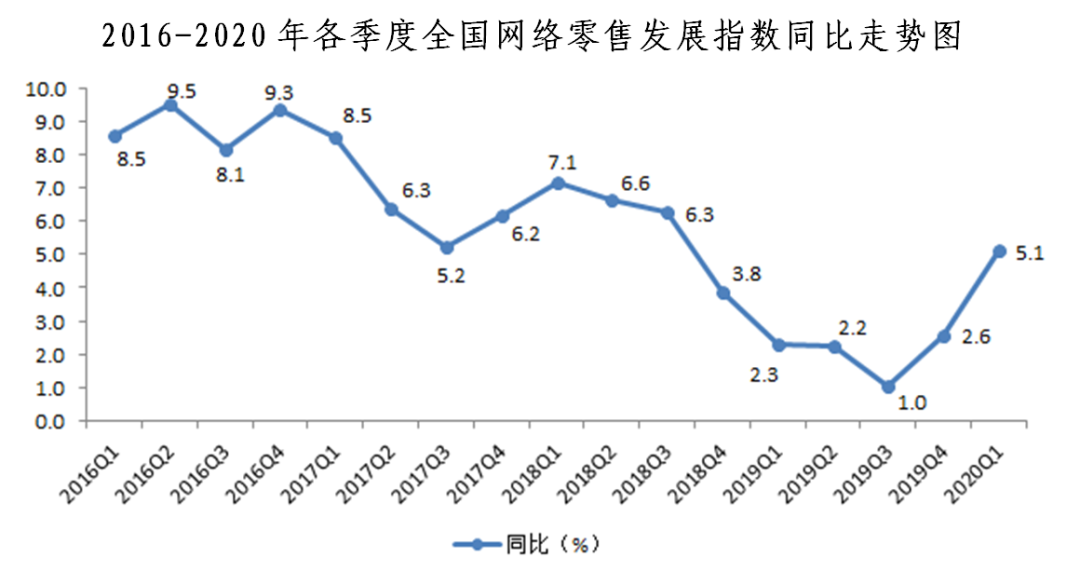 近日,中國國際電子商務(wù)中心與易觀聯(lián)合發(fā)布了2020年一季度“全國網(wǎng)絡(luò)零售發(fā)展指數(shù)”及其分指數(shù)。2020年一季度,全國網(wǎng)絡(luò)零售發(fā)展指數(shù)受疫情影響,環(huán)比下降2.7%,增速較上季度下降6.1個(gè)百分點(diǎn);但同比仍增長(zhǎng)5.1%,增速較上季度提升2.5個(gè)百分點(diǎn)。