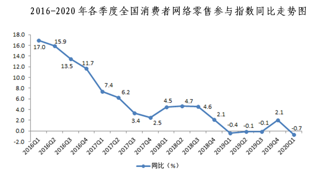三、網(wǎng)絡(luò)零售參與指數(shù)同比下降0.7%,環(huán)比下降4.2%。