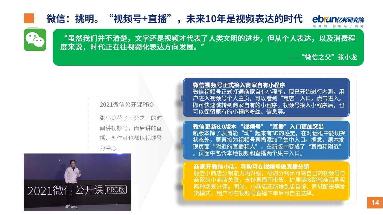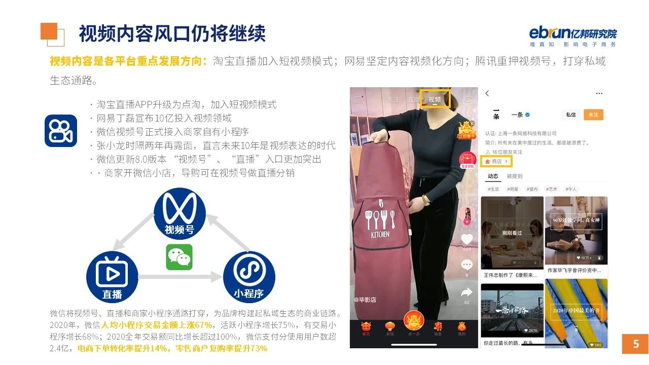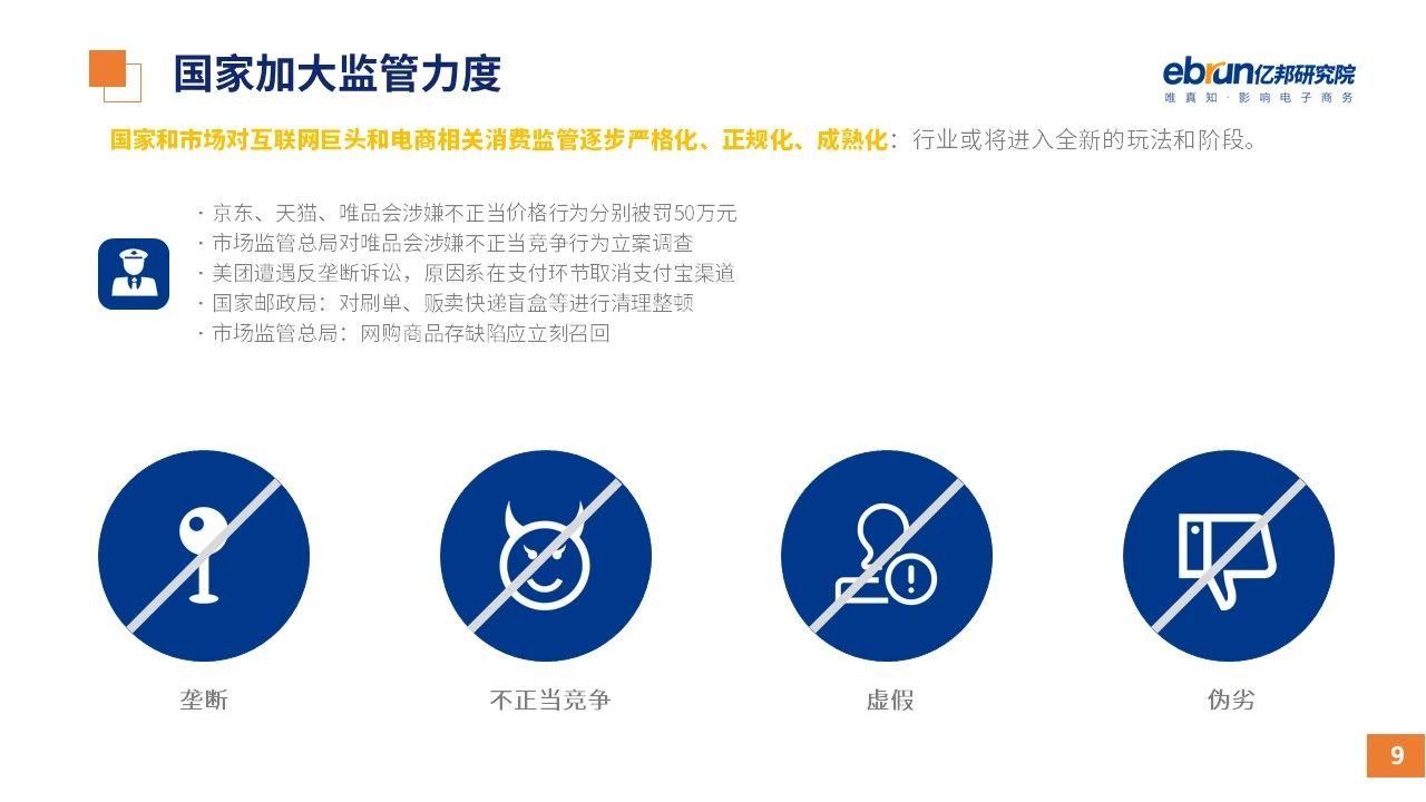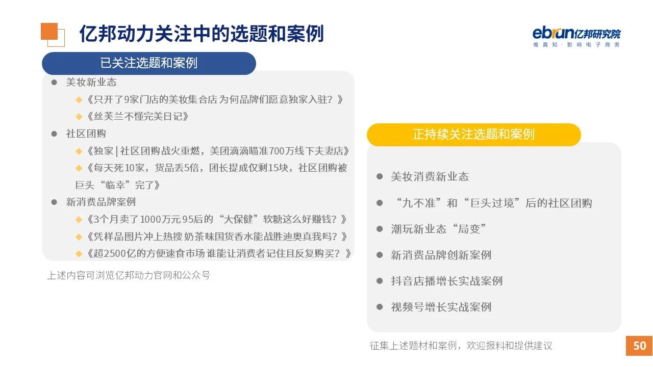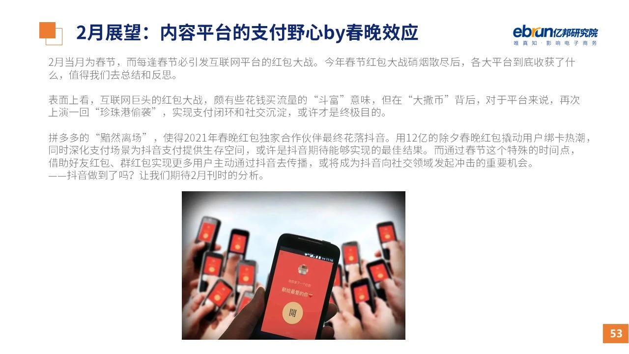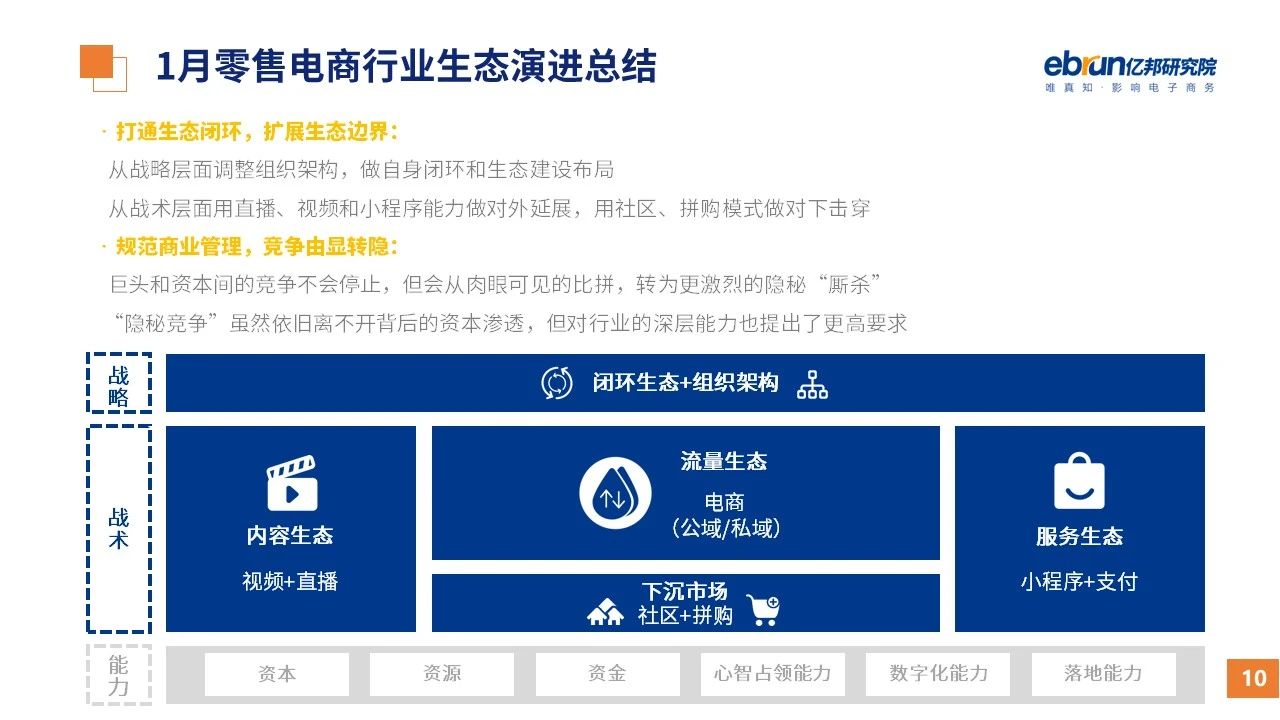 縱觀2021年1月,各平臺豐富自有生態(tài)布局,如淘寶直播(點淘)加入短視頻模式、騰訊重押視頻號、快手加碼電商和小程序、抖音推出支付等;視頻內(nèi)容成為各平臺未來重點發(fā)力方向;“九不得”新規(guī)發(fā)布后社區(qū)團(tuán)購仍熱情不減;國家和市場對互聯(lián)網(wǎng)巨頭和電商相關(guān)消費加大監(jiān)管力度……你信和不信,你知道和不知道的,都在這份億邦動力研究院正式發(fā)布的